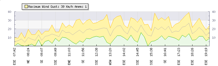 In the last few minutes the wind was South South East at an average speed of 22 kmh, reaching up to 32 kmh and a low of 13 kmh. The gust strength is19 kmh above the minimum speed |