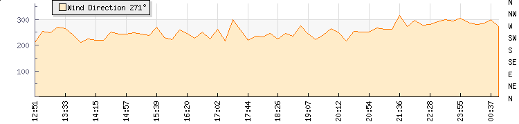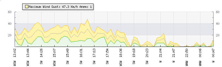 In the last few minutes the wind was West South West at an average speed of 0 kmh, reaching up to 0 kmh and a low of 0 kmh. The gust strength is0 kmh above the minimum speed |