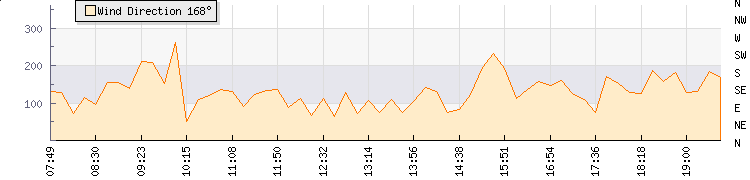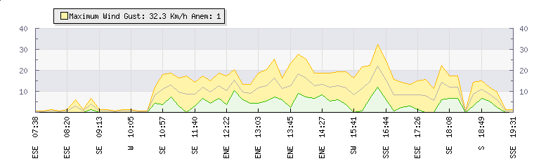 In the last few minutes the wind was Easterly at an average speed of 10 kmh, reaching up to 15 kmh and a low of 5 kmh. The gust strength is10 kmh above the minimum speed |