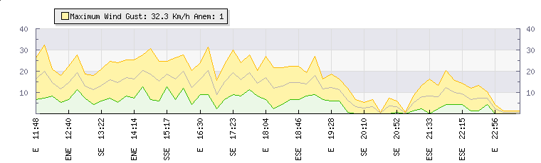 In the last few minutes the wind was East South East at an average speed of 8 kmh, reaching up to 14 kmh and a low of 2 kmh. The gust strength is12 kmh above the minimum speed |