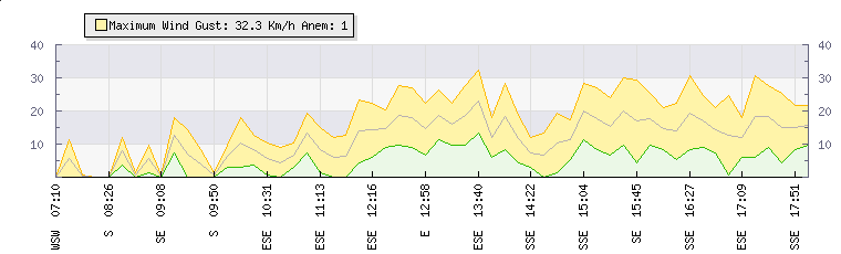In the last few minutes the wind was West South West at an average speed of 1 kmh, reaching up to 1 kmh and a low of 0 kmh. The gust strength is1 kmh above the minimum speed |