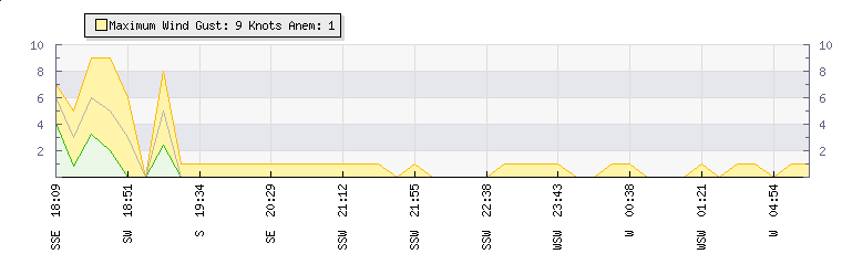 In the last few minutes the wind was West South West at an average speed of 1 knots, reaching up to 1 knots and a low of 0 knots. The gust strength is1 knots above the minimum speed |