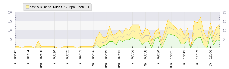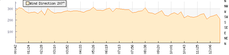 In the last few minutes the wind was Westerly at an average speed of 10 mph, reaching up to 12 mph and a low of 7 mph. The gust strength is5 mph above the minimum speed |