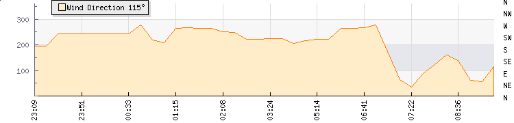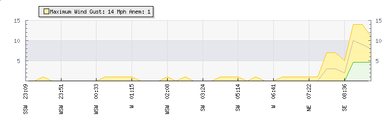 In the last few minutes the wind was South Easterly at an average speed of 2 mph, reaching up to 5 mph and a low of 0 mph. The gust strength is5 mph above the minimum speed |