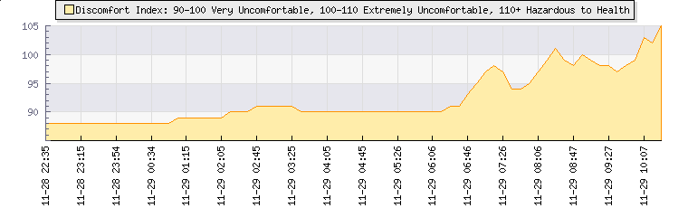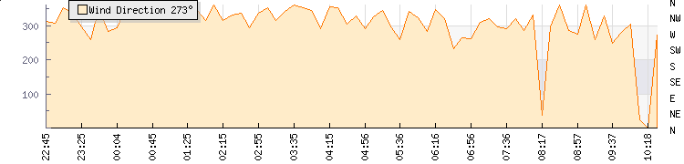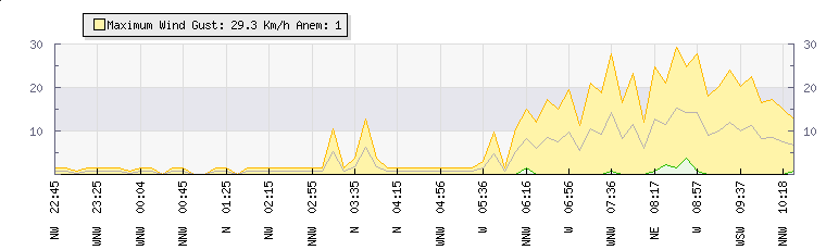 In the last few minutes the wind was West North West at an average speed of 8 kmh, reaching up to 17 kmh and a low of 0 kmh. The gust strength is17 kmh above the minimum speed |
