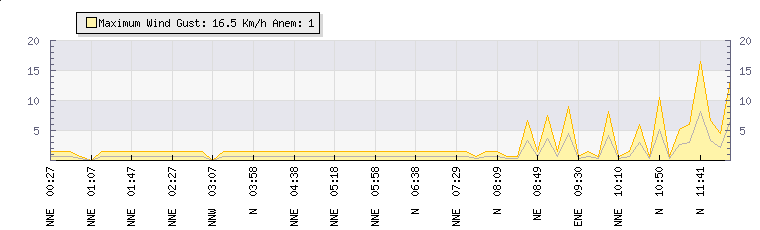 In the last few minutes the wind was North North East at an average speed of 1 kmh, reaching up to 2 kmh and a low of 0 kmh. The gust strength is2 kmh above the minimum speed |