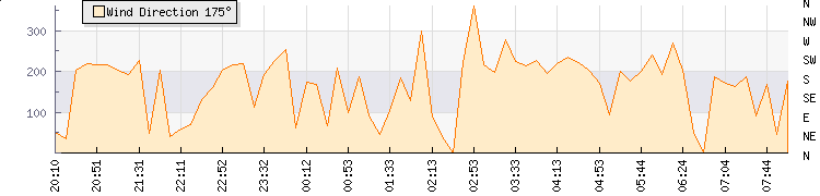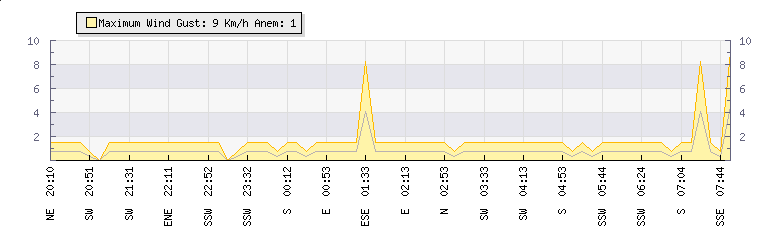 In the last few minutes the wind was South South West at an average speed of 1 kmh, reaching up to 2 kmh and a low of 0 kmh. The gust strength is2 kmh above the minimum speed |