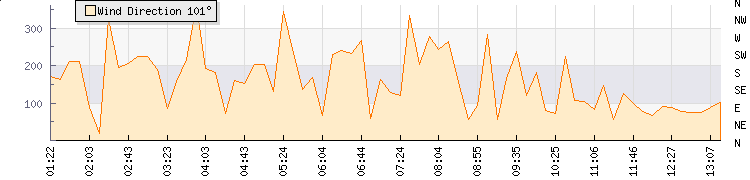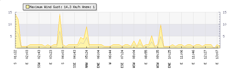 In the last few minutes the wind was West South West at an average speed of 2 kmh, reaching up to 3 kmh and a low of 0 kmh. The gust strength is3 kmh above the minimum speed |