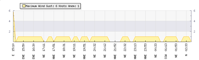 In the last few minutes the wind was South South West at an average speed of 1 knots, reaching up to 1 knots and a low of 0 knots. The gust strength is1 knots above the minimum speed |