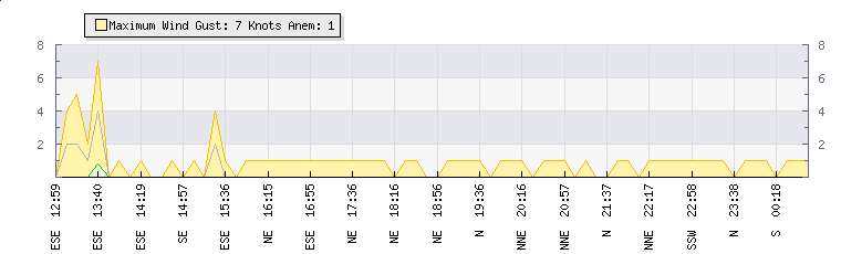 In the last few minutes the wind was Southerly at an average speed of 1 knots, reaching up to 1 knots and a low of 0 knots. The gust strength is1 knots above the minimum speed |