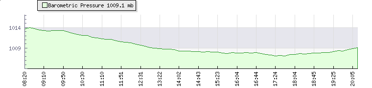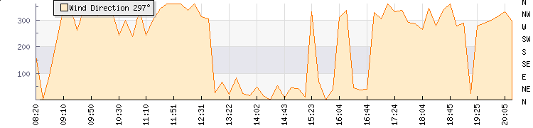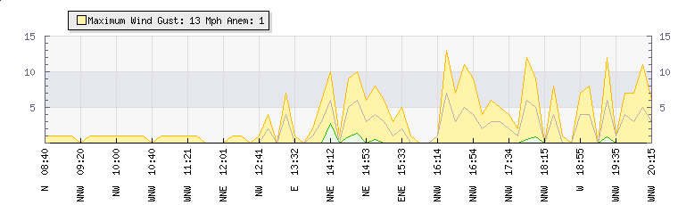 In the last few minutes the wind was Westerly at an average speed of 4 mph, reaching up to 7 mph and a low of 0 mph. The gust strength is7 mph above the minimum speed |