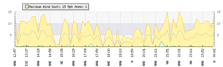 In the last few minutes the wind was West North West at an average speed of 4 mph, reaching up to 8 mph and a low of 0 mph. The gust strength is8 mph above the minimum speed |