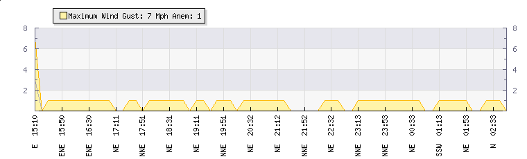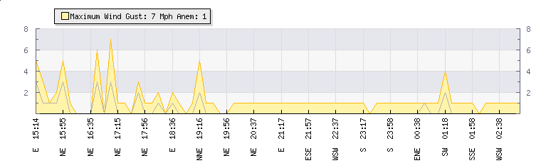 In the last few minutes the wind was South South West at an average speed of 1 mph, reaching up to 1 mph and a low of 0 mph. The gust strength is1 mph above the minimum speed |