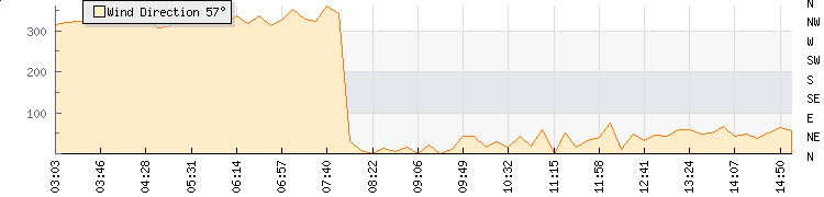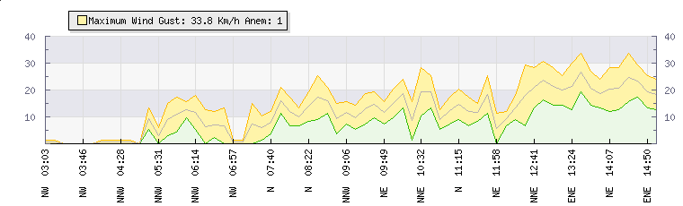 In the last few minutes the wind was North North West at an average speed of 9 kmh, reaching up to 14 kmh and a low of 5 kmh. The gust strength is9 kmh above the minimum speed |