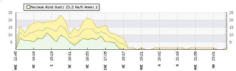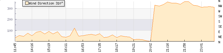 In the last few minutes the wind was North North West at an average speed of 1 kmh, reaching up to 2 kmh and a low of 0 kmh. The gust strength is2 kmh above the minimum speed |