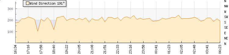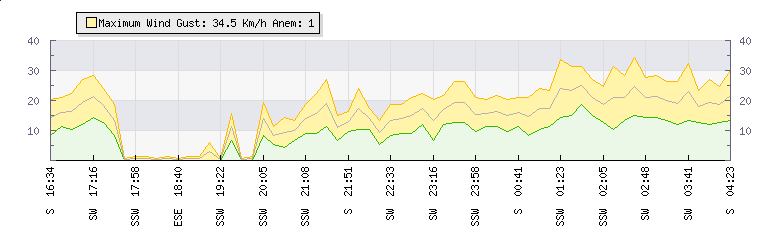 In the last few minutes the wind was South South West at an average speed of 19 kmh, reaching up to 26 kmh and a low of 12 kmh. The gust strength is14 kmh above the minimum speed |