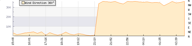 In the last few minutes the wind was Northerly at an average speed of 9 kmh, reaching up to 14 kmh and a low of 3 kmh. The gust strength is11 kmh above the minimum speed |