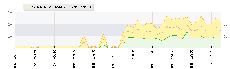In the last few minutes the wind was South South West at an average speed of 20 kmh, reaching up to 26 kmh and a low of 14 kmh. The gust strength is12 kmh above the minimum speed |