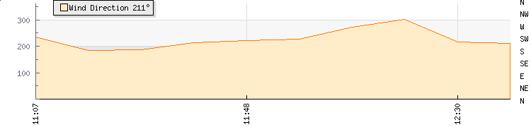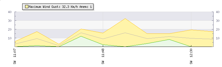 In the last few minutes the wind was North Westerly at an average speed of 11 kmh, reaching up to 17 kmh and a low of 5 kmh. The gust strength is12 kmh above the minimum speed |