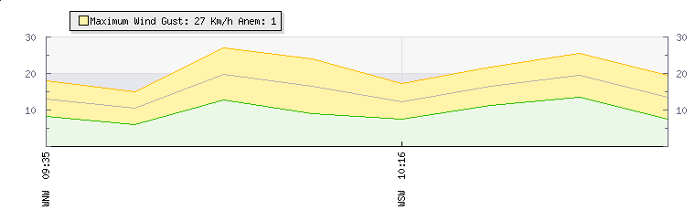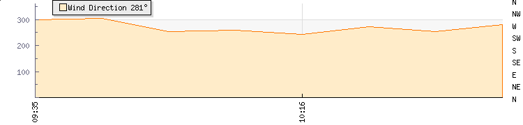 In the last few minutes the wind was Westerly at an average speed of 14 kmh, reaching up to 20 kmh and a low of 8 kmh. The gust strength is12 kmh above the minimum speed |