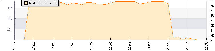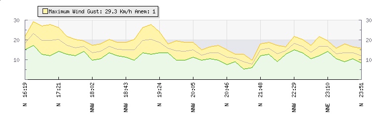 In the last few minutes the wind was Northerly at an average speed of 12 kmh, reaching up to 16 kmh and a low of 8 kmh. The gust strength is8 kmh above the minimum speed |