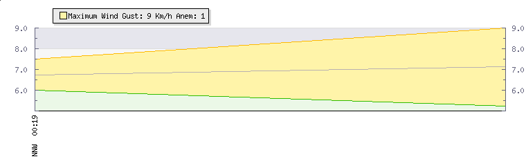 In the last few minutes the wind was West South West at an average speed of 1 kmh, reaching up to 1 kmh and a low of 0 kmh. The gust strength is1 kmh above the minimum speed |