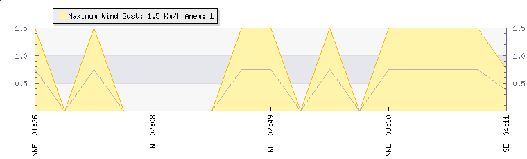 Weather Summary: In the last few minutes the wind was North Easterly at an average speed of 1 kmh, reaching up to 2 kmh and a low of 0 kmh. The gust strength is2 kmh above the minimum speed