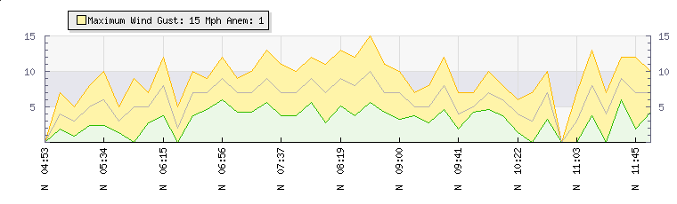 In the last few minutes the wind was Northerly at an average speed of 7 mph, reaching up to 10 mph and a low of 5 mph. The gust strength is5 mph above the minimum speed |