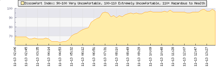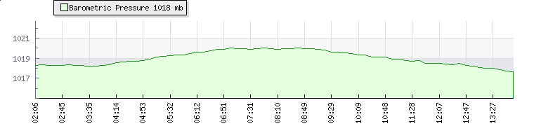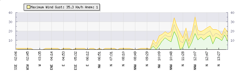 In the last few minutes the wind was North Westerly at an average speed of 13 kmh, reaching up to 18 kmh and a low of 8 kmh. The gust strength is10 kmh above the minimum speed |