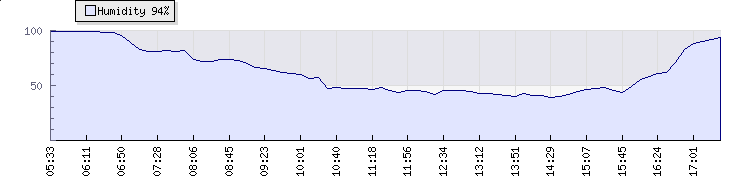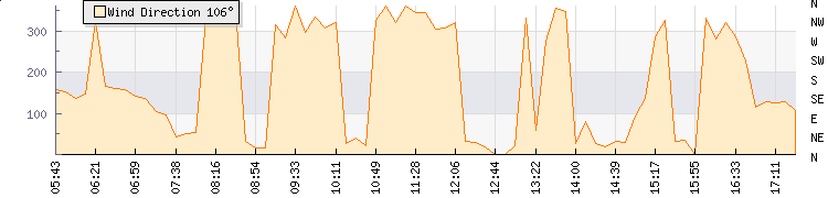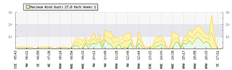 In the last few minutes the wind was North Easterly at an average speed of 9 kmh, reaching up to 14 kmh and a low of 4 kmh. The gust strength is10 kmh above the minimum speed |