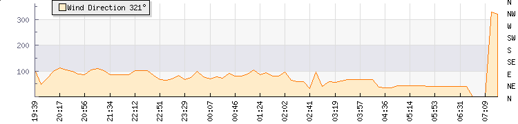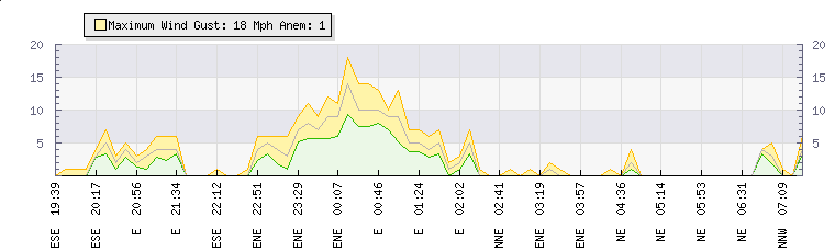 In the last few minutes the wind was North Westerly at an average speed of 4 mph, reaching up to 6 mph and a low of 3 mph. The gust strength is3 mph above the minimum speed |