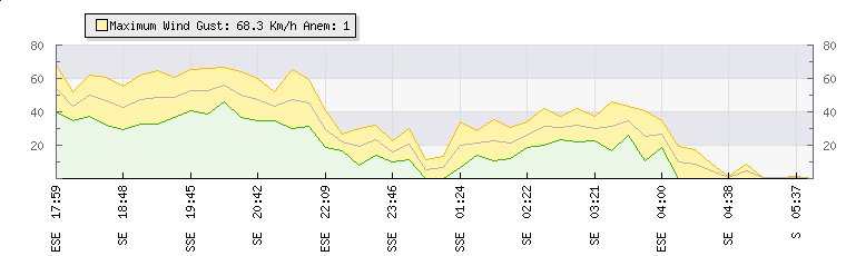 In the last few minutes the wind was South Easterly at an average speed of 47 kmh, reaching up to 60 kmh and a low of 35 kmh. The gust strength is25 kmh above the minimum speed |