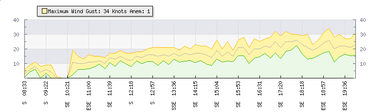 In the last few minutes the wind was South Easterly at an average speed of 23 knots, reaching up to 31 knots and a low of 16 knots. The gust strength is15 knots above the minimum speed |