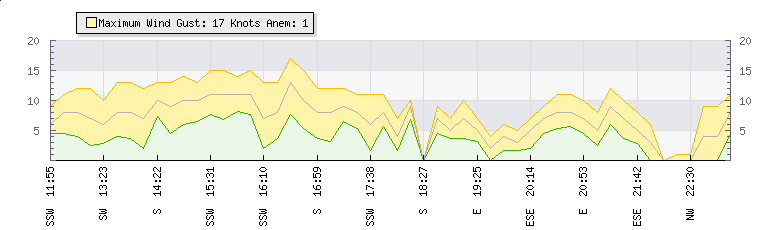 In the last few minutes the wind was East South East at an average speed of 0 knots, reaching up to 0 knots and a low of 0 knots. The gust strength is0 knots above the minimum speed |