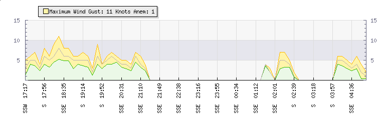 In the last few minutes the wind was Southerly at an average speed of 0 knots, reaching up to 0 knots and a low of 0 knots. The gust strength is0 knots above the minimum speed |