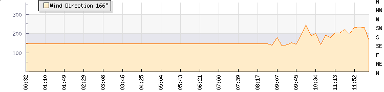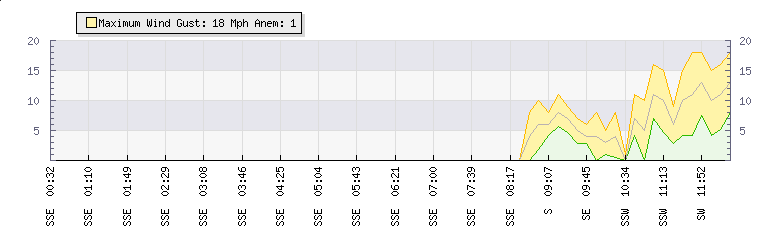 In the last few minutes the wind was South South East at an average speed of 0 mph, reaching up to 0 mph and a low of 0 mph. The gust strength is0 mph above the minimum speed |