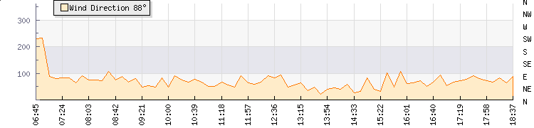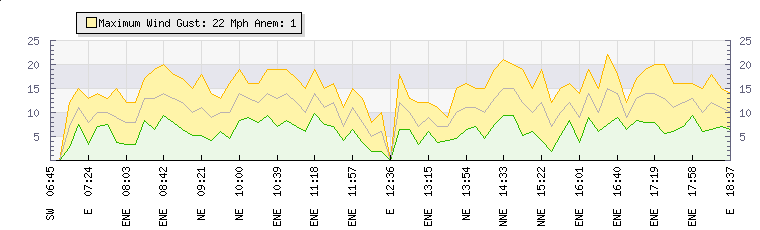 In the last few minutes the wind was East North East at an average speed of 10 mph, reaching up to 15 mph and a low of 6 mph. The gust strength is9 mph above the minimum speed |