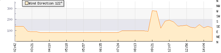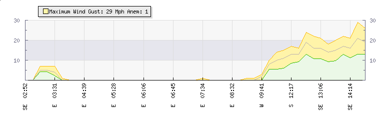 In the last few minutes the wind was South Easterly at an average speed of 14 mph, reaching up to 18 mph and a low of 9 mph. The gust strength is9 mph above the minimum speed |