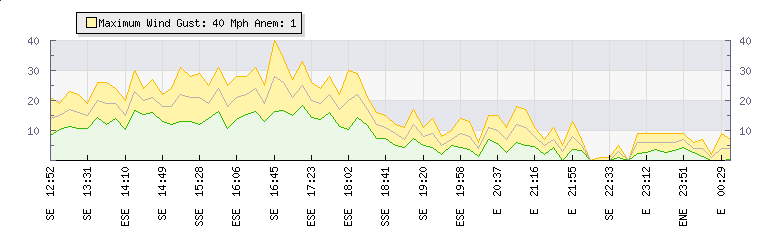 In the last few minutes the wind was Easterly at an average speed of 6 mph, reaching up to 9 mph and a low of 3 mph. The gust strength is6 mph above the minimum speed |