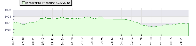 | Wind Speed: | 13|19|25 kmh | Wind Direction: | ESE 114° | Temperature: | 15.1°C | | Wet Bulb: | 14.8°C | Discomfort: | 69 | Humidity: | 97% | | Rainfall Today: | 22.8mm | 12 hrs Rainfall: | 22.8mm | 24 hrs Rainfall: | 22.8mm | | Barometer: | 1022.2mb | Dew Point: | 14.6°C | Clouds AGL: | 189ft (58 m) | | Density-Alt: | 5492ft (1674 m) | Fire Danger: | |