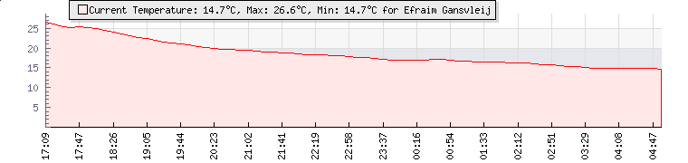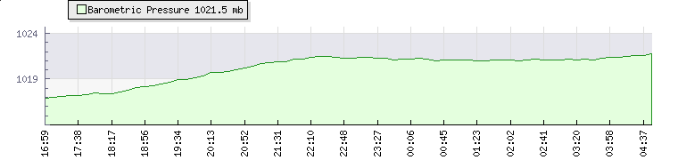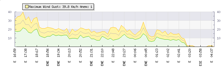 | Wind Gust: | 29 km/h | Min Temp: | 15.5 °C | Max Temp: | 17.3 °C | | Wind Average: | 22 km/h | Min Hum: | 91 % | Max Hum: | 97 % | |  |