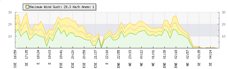 In the last few minutes the wind was East South East at an average speed of 19 kmh, reaching up to 25 kmh and a low of 13 kmh. The gust strength is12 kmh above the minimum speed |