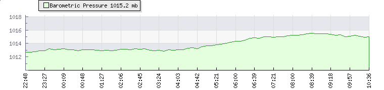 | Wind Speed: | 9|15|20 kmh | Wind Direction: | ESE 115° | Temperature: | 21.9°C | | Wet Bulb: | 18.1°C | Discomfort: | 83 | Humidity: | 71% | | Rainfall Today: | 0mm | 12 hrs Rainfall: | 0mm | 24 hrs Rainfall: | 0mm | | Barometer: | 1015.6mb | Dew Point: | 16.4°C | Clouds AGL: | 2201ft (671 m) | | Density-Alt: | 6499ft (1981 m) | Solar Radiation: | 182Wm² | Fire Danger: | |