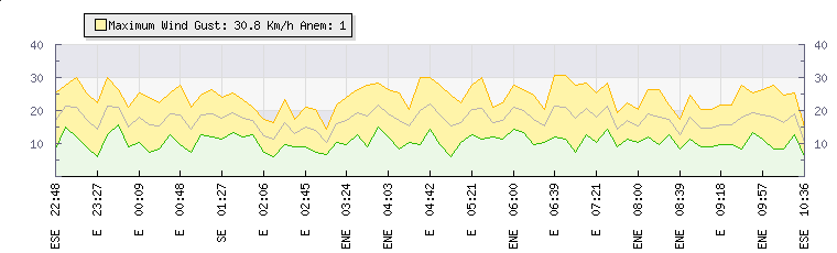 In the last few minutes the wind was East South East at an average speed of 15 kmh, reaching up to 20 kmh and a low of 9 kmh. The gust strength is11 kmh above the minimum speed |
