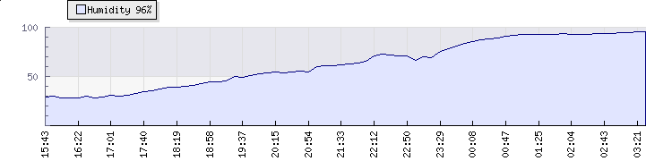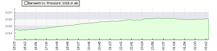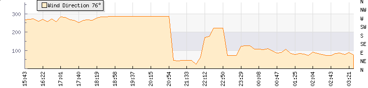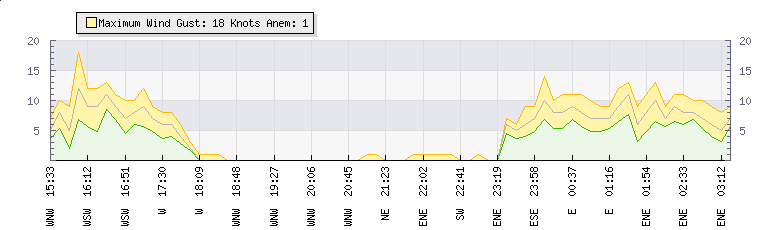 Wind Gust: | 13 knots | Min Temp: | 13.5 °C | Max Temp: | 13.8 °C | Wind Average: | 11 knots | Min Hum: | 87 % | Max Hum: | 93 % | |  |