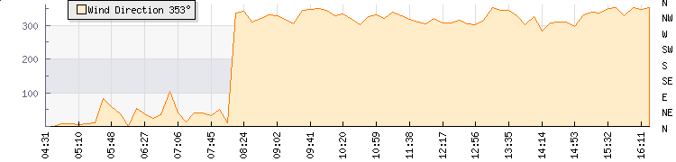 In the last few minutes the wind was North North West at an average speed of 0 mph, reaching up to 0 mph and a low of 0 mph. The gust strength is0 mph above the minimum speed |