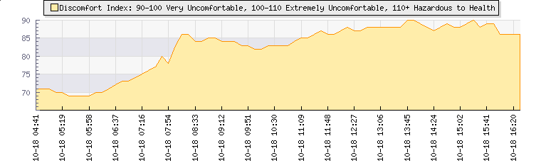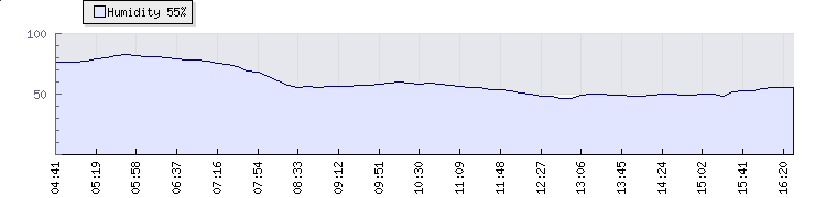 Wind Speed: | 0|0|0 mph | Wind Direction: | NNW 337° | Temperature: | 23.6°C | Wet Bulb: | 18.4°C | Discomfort: | 86 | Humidity: | 61% | Rainfall Today: | 0mm | 12 hrs Rainfall: | 0mm | 24 hrs Rainfall: | 0mm | Barometer: | 1019.9mb | Dew Point: | 15.6°C | Clouds AGL: | 3188ft (972 m) | Density-Alt: | 6539ft (1993 m) | Solar Radiation: | 309Wm² | Fire Danger: | |