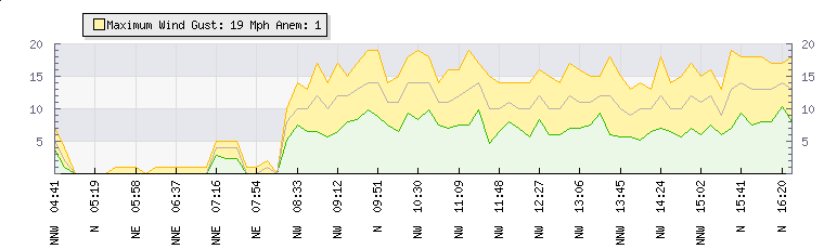 Wind Gust: | 22 mph | Min Temp: | 15.7 °C | Max Temp: | 23.6 °C | Wind Average: | 16 mph | Min Hum: | 61 % | Max Hum: | 83 % | |  |