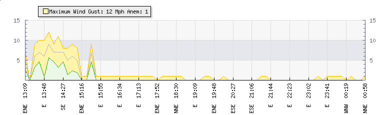 In the last few minutes the wind was Easterly at an average speed of 1 mph, reaching up to 1 mph and a low of 0 mph. The gust strength is1 mph above the minimum speed |