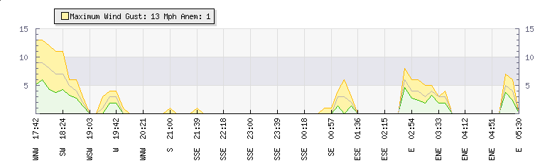| Wind Gust: | 8 mph | Min Temp: | 15.6 °C | Max Temp: | 18.4 °C | | Wind Average: | 6 mph | Min Hum: | 72 % | Max Hum: | 96 % | |  |